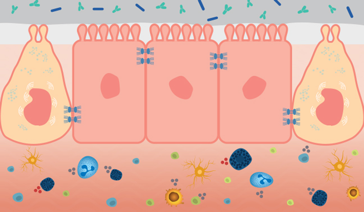 Elle est constituée d’une couche de cellules, maintenues adhérentes les unes aux autres par des « jonctions serrées » (en anglais tight junctions) et recouvertes d’une couche de mucus. L’adhérence des “tight junctions” et l’épaisseur du mucus sont essentielles pour la santé de la barrière.